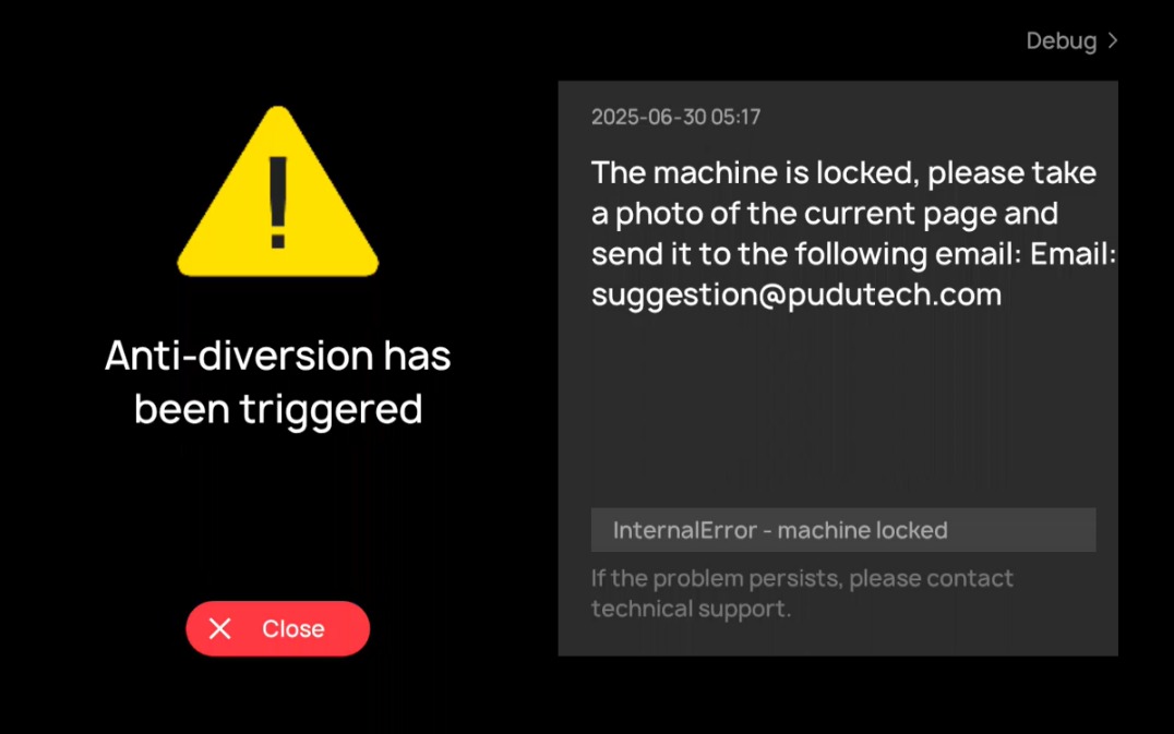 The Anti-Diversion Error is triggered by the anti-diversion interface. This error generally occurs when the map has been modified while the robot is not connected to a network.